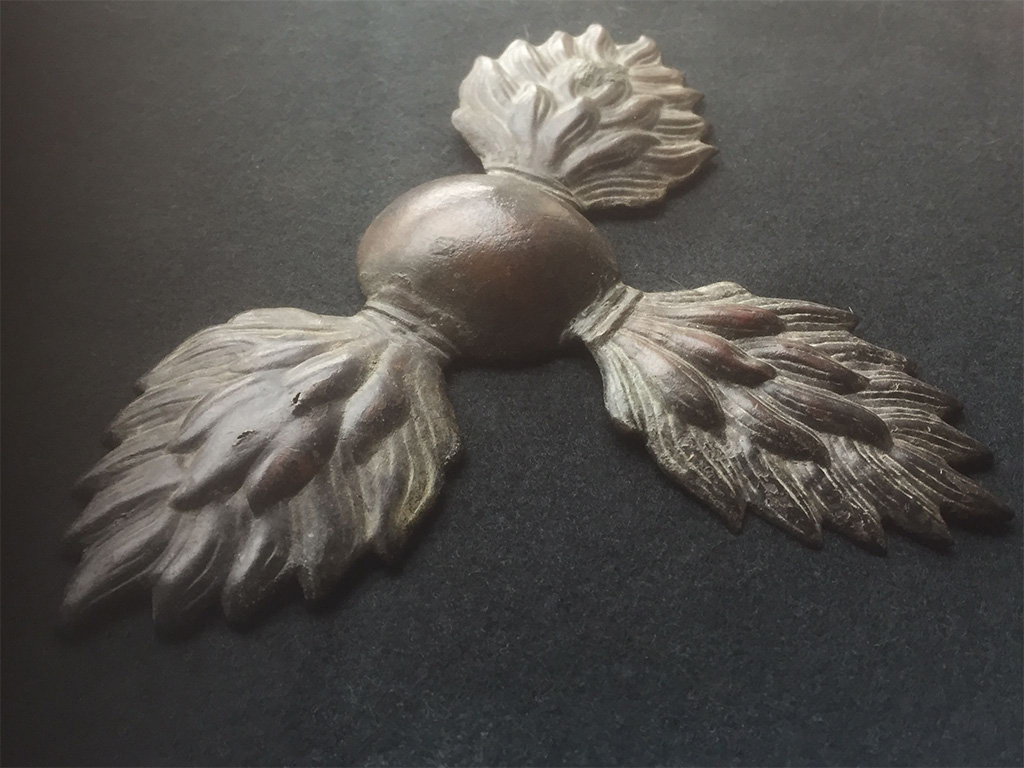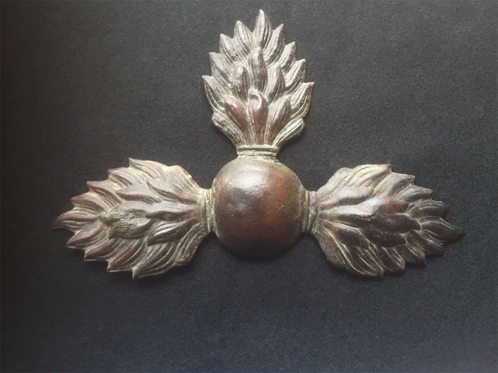 Russian Grenadier cartridge pouch insignia. Triple-flamed grenade. Recovered from the battlegrounds near Sevastopol (Севастополь Ru/Ukr) on the south-west of Crimea (Крым Ru/Крим Ukr).